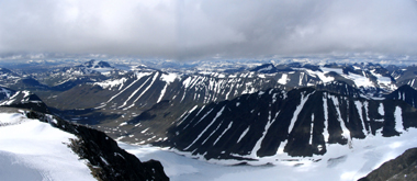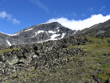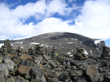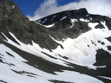 Wie ein Zuckerhut zeigt sich der nun endlich sichtbare, vereiste Südgipfel des Kebnekaise. Und kein Wölkchen hüllt ihn jetzt mehr ein, halleluja!