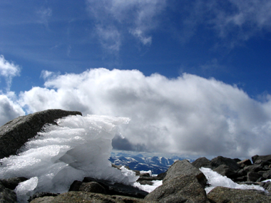 Ein erster Blick rüber zum eigentlichen Gipfel, der aber leider hinter Wolken verdeckt ist. Wir überlegen kurz, ob sich der Aufstieg da überhaupt noch lohnt... gehen aber dann entschlossen weiter.